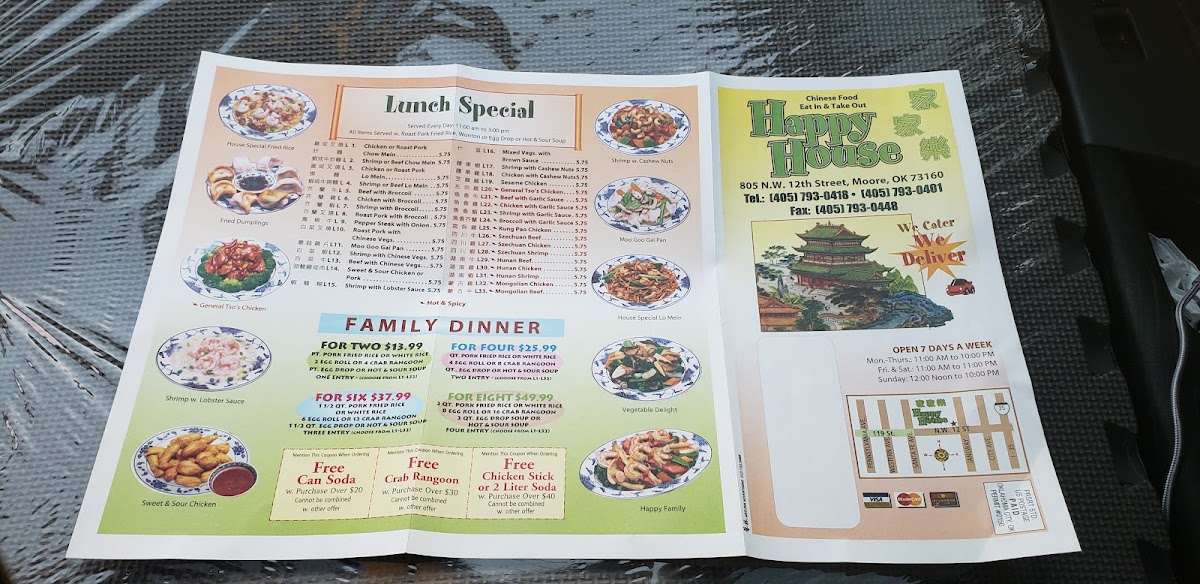 Don't forget to try their delectable side options like crispy noodles and assorted sauces. Drinks like Sprite and Coke add a refreshing touch to your meal. Customers rave about the fast service and the incredible flavors that leave them returning for more. Discover the joy of authentic Chinese dining at Happy House Moore!